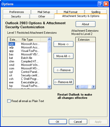 Attachment OptionsAttachment Options is a COM add-in for Microsoft® Outlook® 2000 SP3 or higher, Outlook 2002, and Outlook 2003 or Outlook 2007 that provides a user interface for changing which file types are restricted as Level 1 attachments. Level 1 attachments are hidden by Outlook, and cannot be seen, saved or opened from Outlook items. Moving an attachment extension to Level 2 enables the user to see the attachment and to save it to the file system. The attachment saved to the file system can later be opened by the user. To open the Attachment Options property page select the Tools menu, then select Options and go to the Attachment Security & Options tab. Move any file extensions from the Level 1 list to the Level 2 list, or from the Level 2 list to the Level 1 list as desired. Files are moved from the Level 1 list to the Level 2 list by selecting file extensions and clicking the Move or Move All buttons. Files are moved from the Level 2 list to the Level 1 list by selecting file extensions and clicking the Remove or Remove All buttons. Attachment Options also provides a check box to enable reading all e-mail as Plain Text, avoiding HTML e-mail virus and malware exploits, for Outlook 2002, 2003 and 2007. The reading e-mail as Plain Text feature is not available for Outlook 2000.